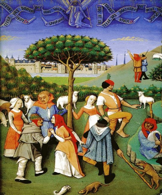 Les principales danses sont la carole, la tresque, l'estampie, la saltarello, la basse danse, la moresque, ...